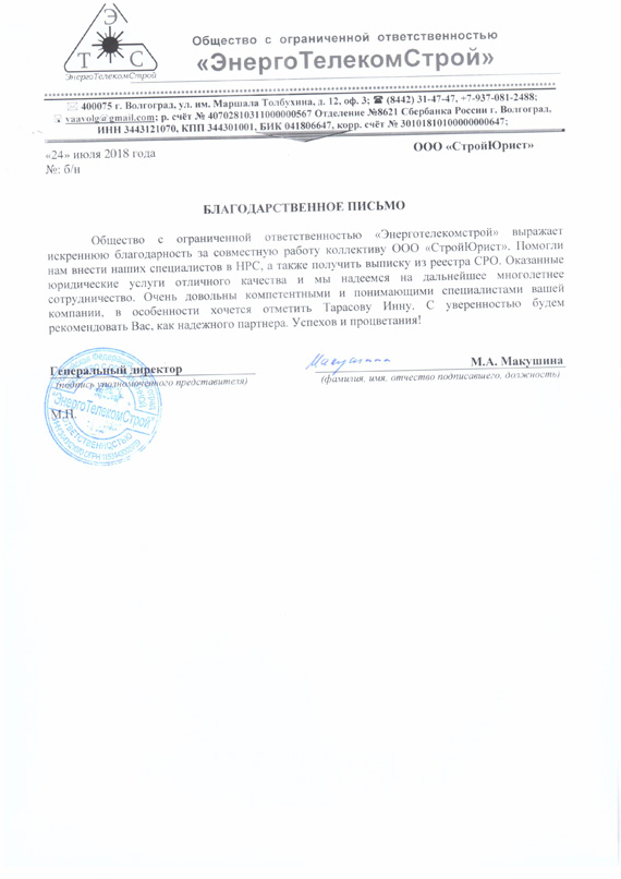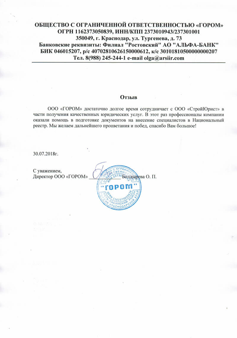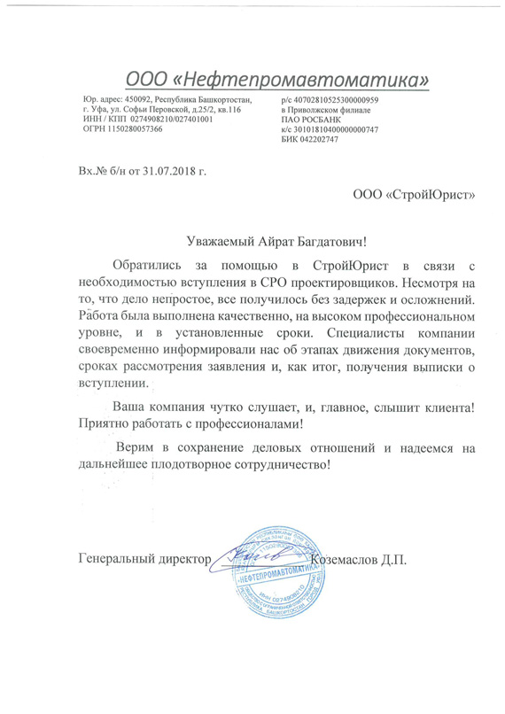 Отзывы клиентов "СтройЮрист" по вступлению в СРО в Альметьевске